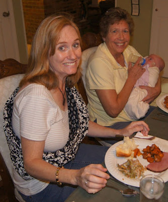 | Aunt Pam, Gracie and me - note the sling, ready to receive a fussy baby. My, the food was GOOD! My mom rocked that menu with my dad's shopping help. I just kind of showed up to the table. |